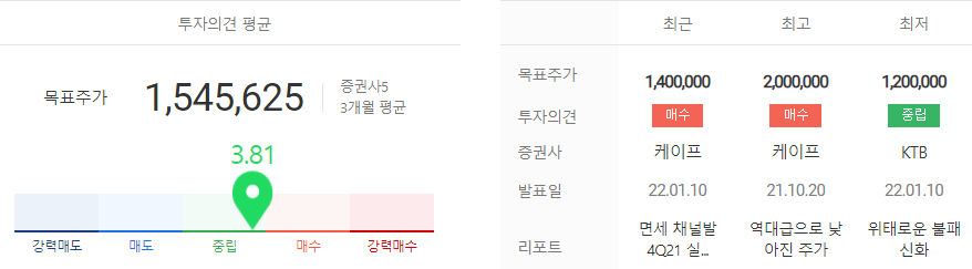 증권사 5 업체 3개월 평균 목표주가는 1,545,625원이다.