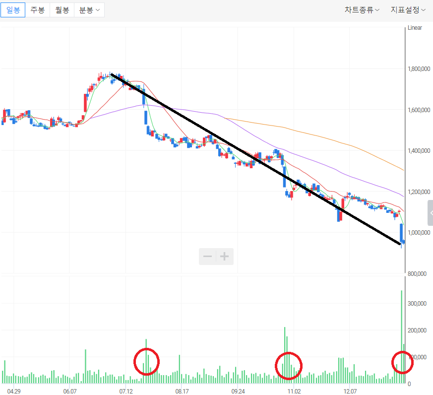 ㄱ) 일봉 차트에서 작년 7월에 고점을 만들고 쉬지 않고 계속 하락하고 있는 추세이다. 1월 10일 고점 대비 반토막이 난 상태에서, 대량의 거래량을 수반하며 약 16%가 하락하였다.