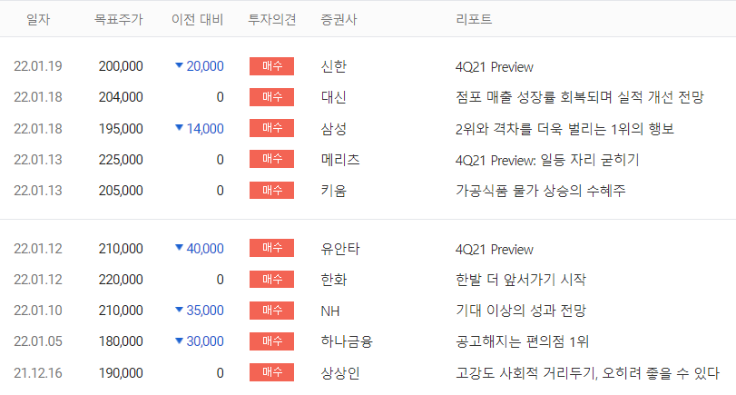 ⓑ 1월 18일 대신증권에서는 목표주가 204,000원 투자의견 매수를 제시하였으며, 점포 매출 설 장률 회복되며 실적 개선을 전망하였다.