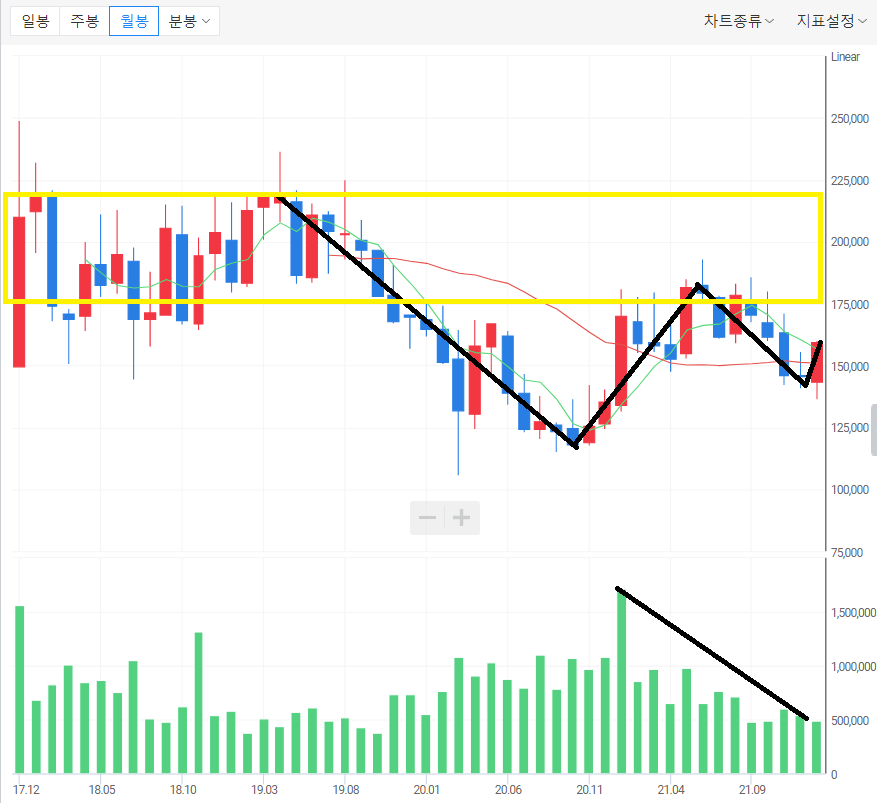 ㄴ) 월봉 차트에서 만약에 상승한다면 W자 형태가 된다.