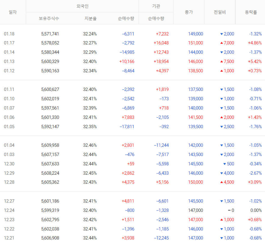 ⓒ 1월 18일 삼성증권에서는 목표주가 195,000원 투자의견 매수를 제시하였으며, 실적을 바탕으로 2위와 격차를 더욱 벌리는 1위의 행보라고 전망하였다.