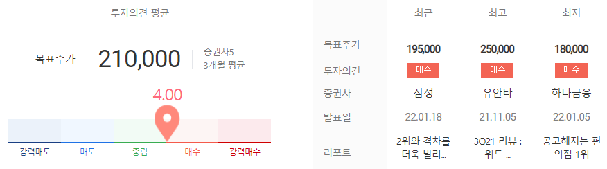 ⓐ 1월 19일 신한증권에서는 목표주가 200,000원 투자의견 매수를 제시하였으며, 2021년 4분기 실적은 컨센서스에 부합할 것으로 예상하였습니다.