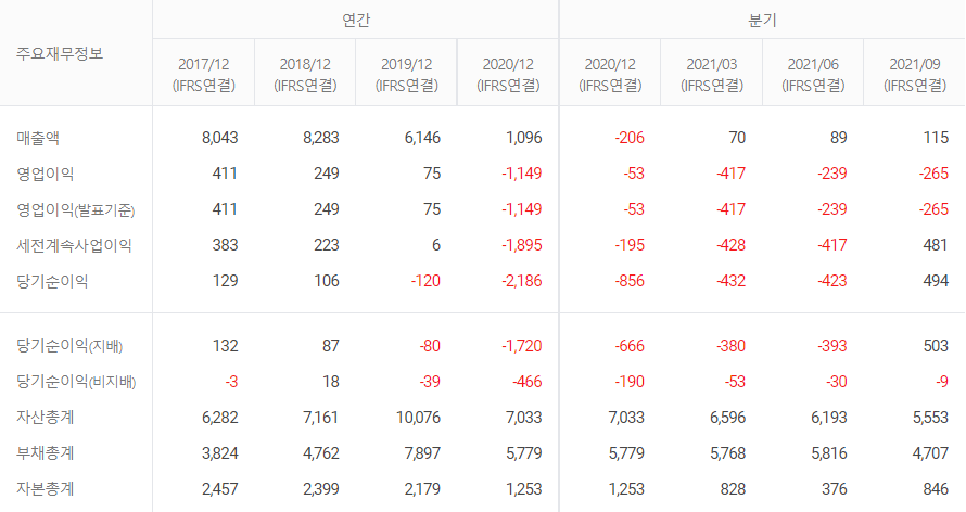 ㄱ) 2021년 9월 전년 동기 대비 연결기준 매출액은 73.4% 감소, 영업손실은 3.3% 증가, 당기순손실은 74.4% 감소하였다.