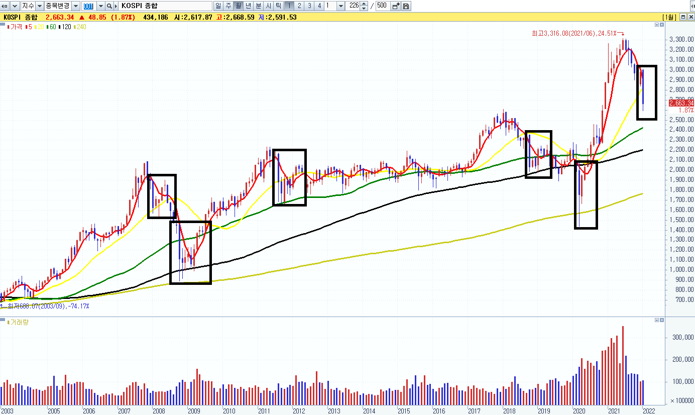 지난 2021년 6월을 기점으로 2022년 1월까지 7개월 동안 코스피가 하락 중이다. 추가로 더 하락할지는 알 수 없으나, 이런 지수의 하락 뒤에는 반등이라는 기회가 찾아왔다. 이 반등이라는 기회에서 지수가 하락할 때의 손실을 만회할 수 있는 수익을 내기 위해서 주도주를 찾아서 매수해야 한다.