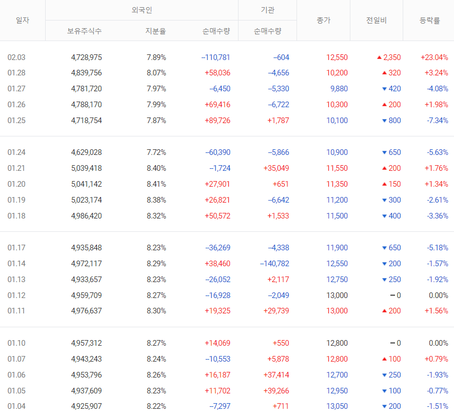 ㄱ) 1월 1일부터 2월 3일까지 개인 23.1억 매도, 외국인 19.8억 매수, 기관 0.5억 매도 중이다.