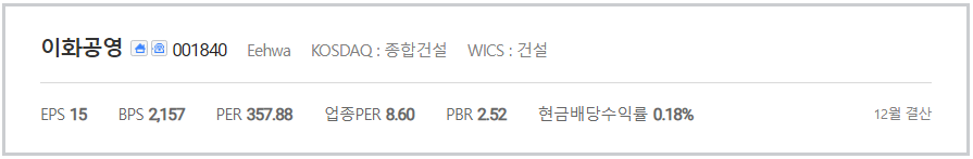 이화공영의 현재 실적은 기대할 것은 없다. PER은 과한 것으로 보인다. 다만 이명박 전 대통령 관련주로 분류되면서 이명박 전 대통령의 사면 이슈로 주가가 상승한 테마주에 가깝다.