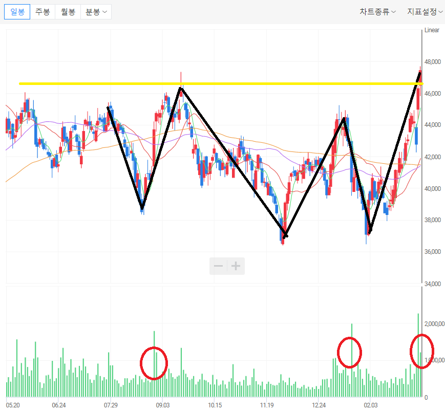 ㄴ) 월봉 차트에서 약 2.5만 원에서 오만 원까지 10년간 박스권을 만들었다. 5, 20, 60월선이 상승하려고 하는 모습이다. 상승하기까지에는 거래량이 더 필요해 보인다.