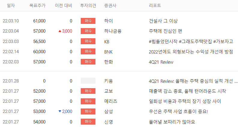 ⓐ 3월 10일 하이투자증권에서는 목표주가 6.1만 원 투자의견 매수를 제시하였으며, 주택 호조와 신사업 확장으로 2022년 영업이익은 대폭 증가한다고 하였다.