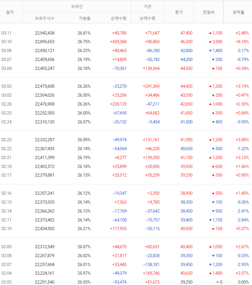 ㄱ) 2월 1일부터 3월 11일까지 투자자별 누적 순매수는 개인 722.7억 매도, 외국인 247.4억 매수, 기관 435.4억 매수 중이다.