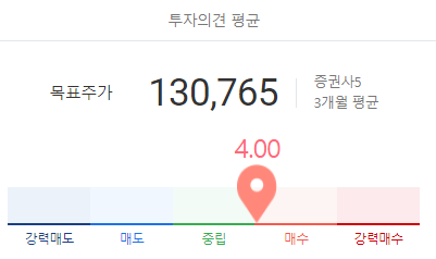 증권사 5 업체의 3개월 평균 목표주가는 130,765원이다.