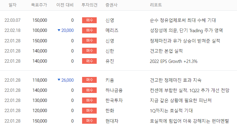 ⓐ 3월 7일 신영증권에서는 목표주가 15만 원, 투자의견 매수를 제시하였으며, 러시아와 우크라이나 사태에 따른 유가상승 최대 수혜가 될 것이며, 탈러시아 에너지 정책으로 정유사업 실적 호조를 누릴 것이라고 전망하였다.