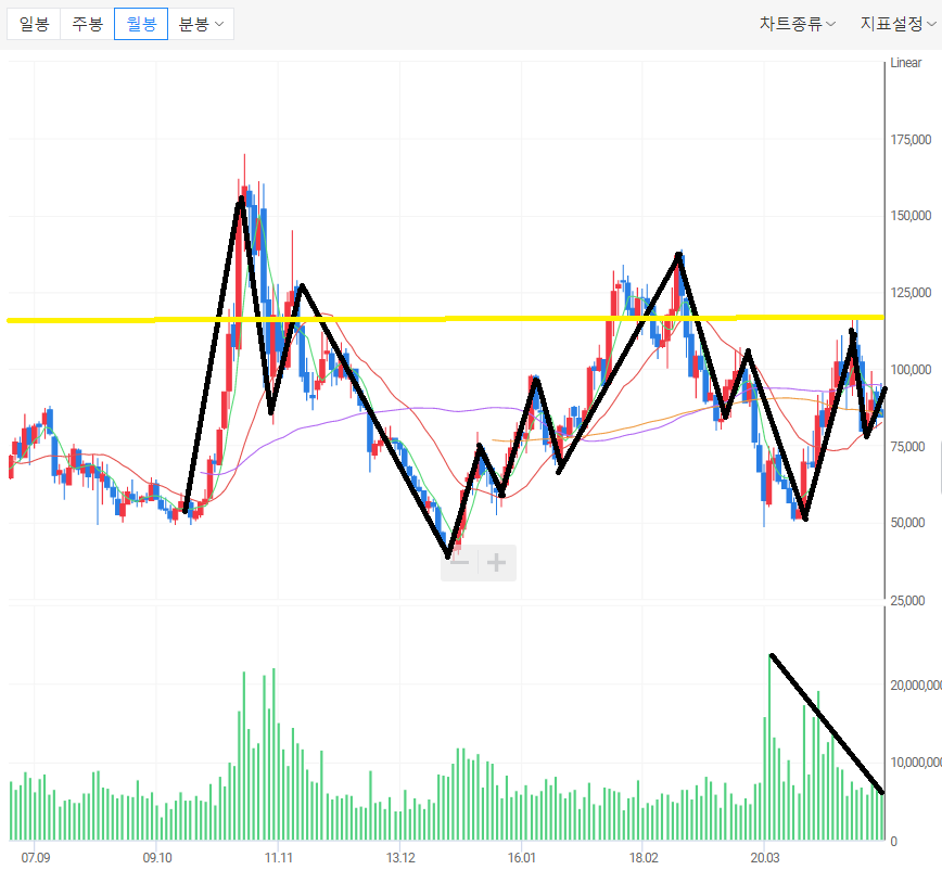 ㄴ) 월봉 차트에서 상승하고 조정받고 상승하고 조정받는 모습이 반복적이다. 아무래도 12만 원 위에 있는 매물대를 뚫기가 쉽지 않아 보인다.