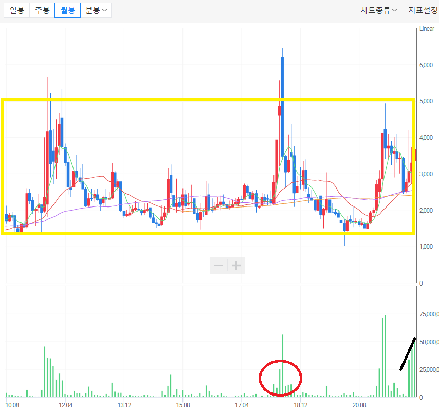 ㄴ) 월봉 차트에서도 거래량이 증가하는 모습이 좋아 보인다. 상당히 오랜 기간 동안 박스권의 흐름을 보이고 있다는 것을 유념해 두자.