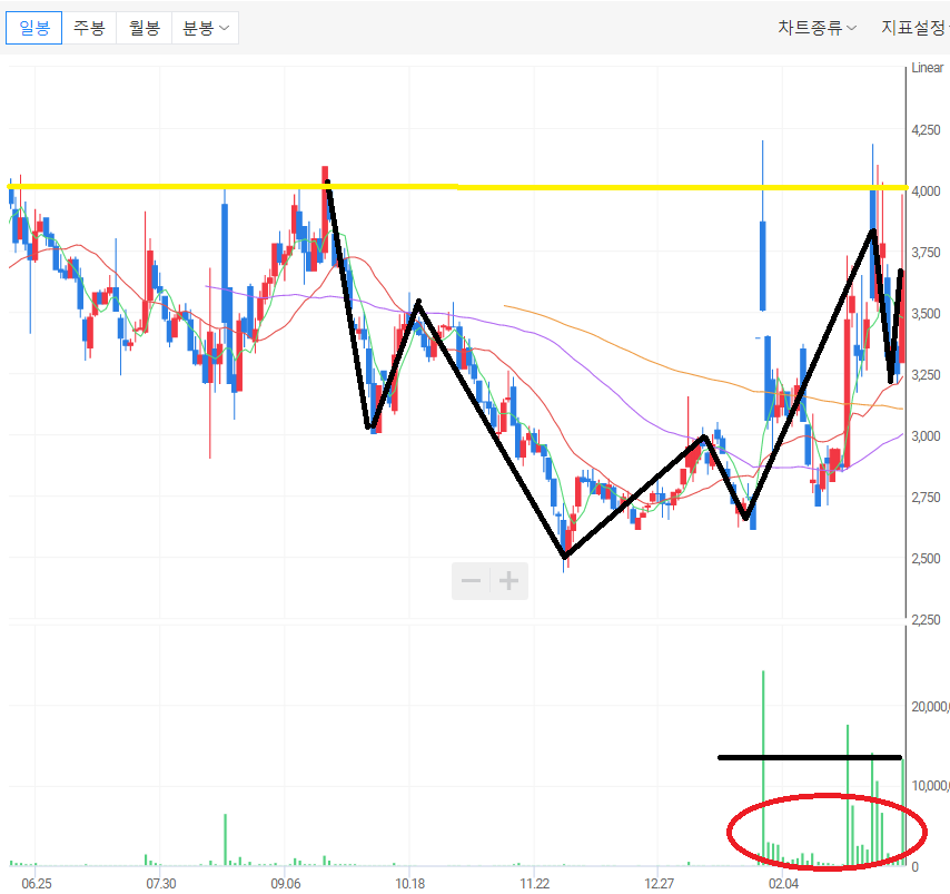 ㄱ) 일봉 차트에서 거래량이 증가하면서 상승하려는 움직임을 보이고 있다. 매물대는 4천 원 부근으로 전고점에서 하락을 두 번 하였다. 이번에는 전고점을 뚫고 상승하리라고 보인다.
