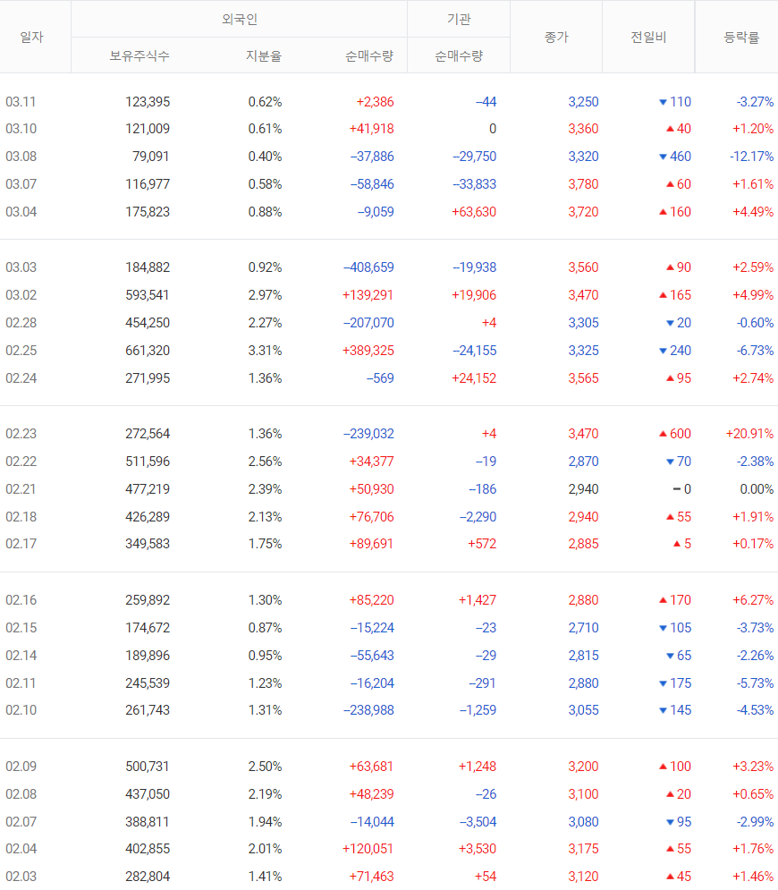 ㄴ) 3월 14일 수급은 개인 2.6억 매도, 외국인 2.5억 매수, 기관 0.08억 매도하였다.
