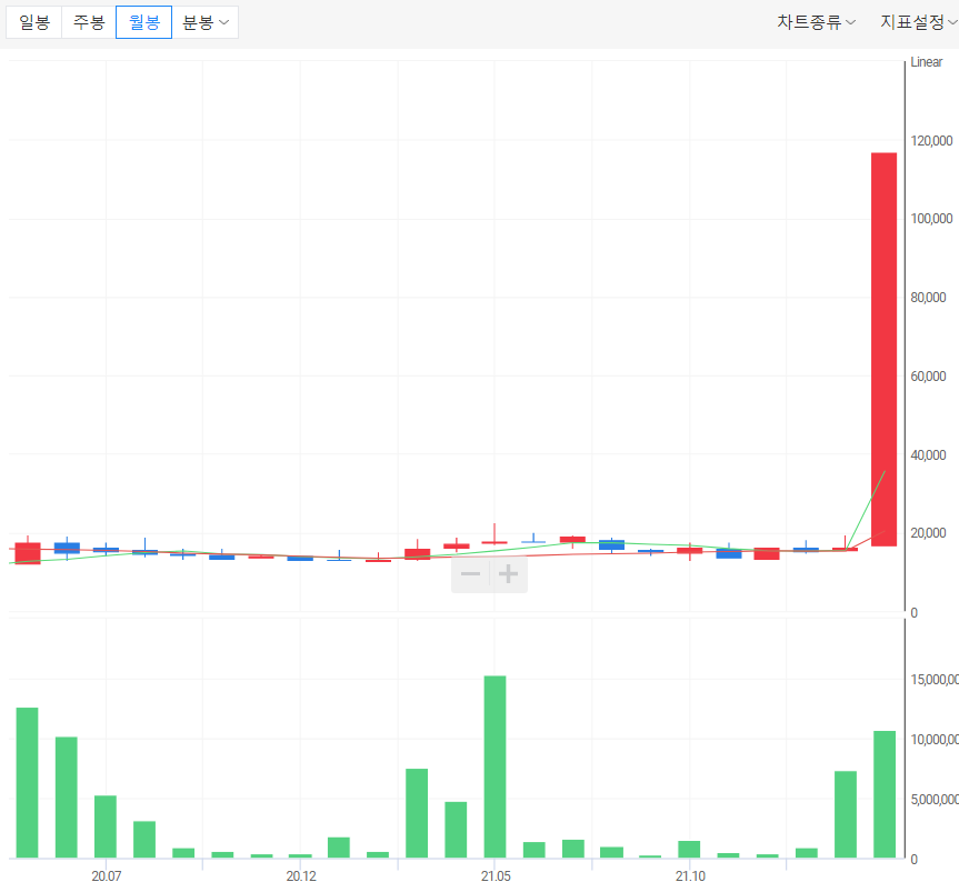 ㄴ) 월봉으로 약 600%가 상승한 종목으로 2일 연속으로 대량의 거래량을 발생한 것으로 보아서 세력들은 일부 매도하였을 것이며, 지금은 폭탄 돌리기로 보인다.
