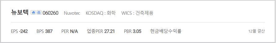 뉴보텍의 실적은 2년 연속으로 적자이고 수급도 개인들이 주체이다. 하지만 뉴보텍은 수도 사업과 관련된 하수 관재, 상수 관재 등의 제품을 판매하는 상하수도 관련한 전문 회사이다. 서울시가 2040 수도정비 기본계획의 정책을 발표한 것을 모멘텀으로 뉴보텍은 상한가를 기록하는 강한 모습을 보였고 지금은 상승 흐름의 위치에 있다.