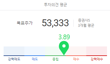 증권사 5 업체의 3개월 평균 목표주가는 53,333원이다.