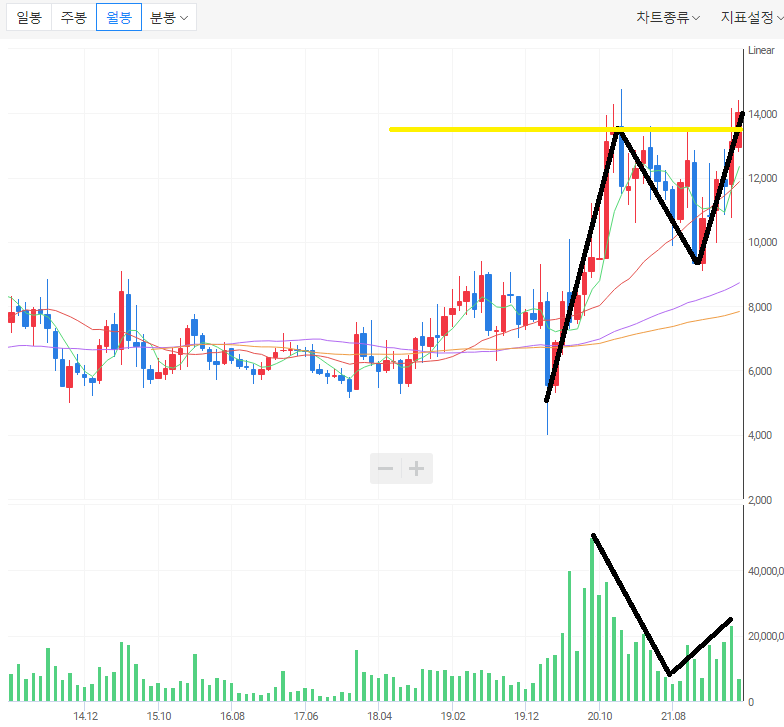 ㄴ) 월봉 차트에서 오랜 기간 동안 수렴 후 N자 형태로 상승하려고 하는 움직임이다.