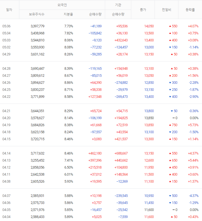 ㄴ) 5월 6일 수급은 개인 10.4억 매도, 외국인 5.8억 매도, 기관 13.4억 매수하였다.