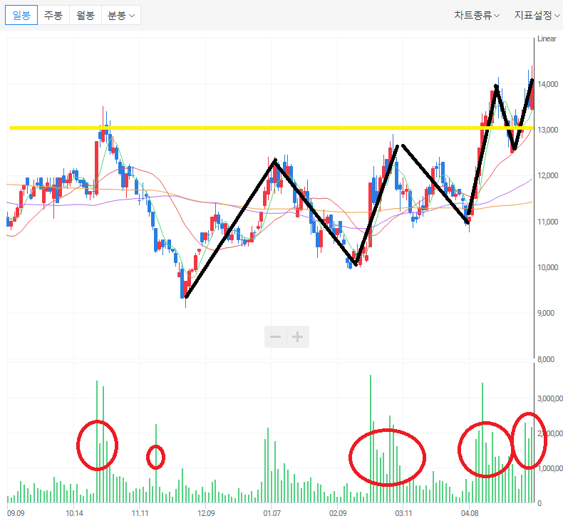 ㄱ) 일봉 차트에서 바닥에서 상승하고 조정받고 다시 상승하고 조정받으면서 우상향하고 있다. 전고점의 매물대를 뚫고 올라가려고 하는 모습이다.