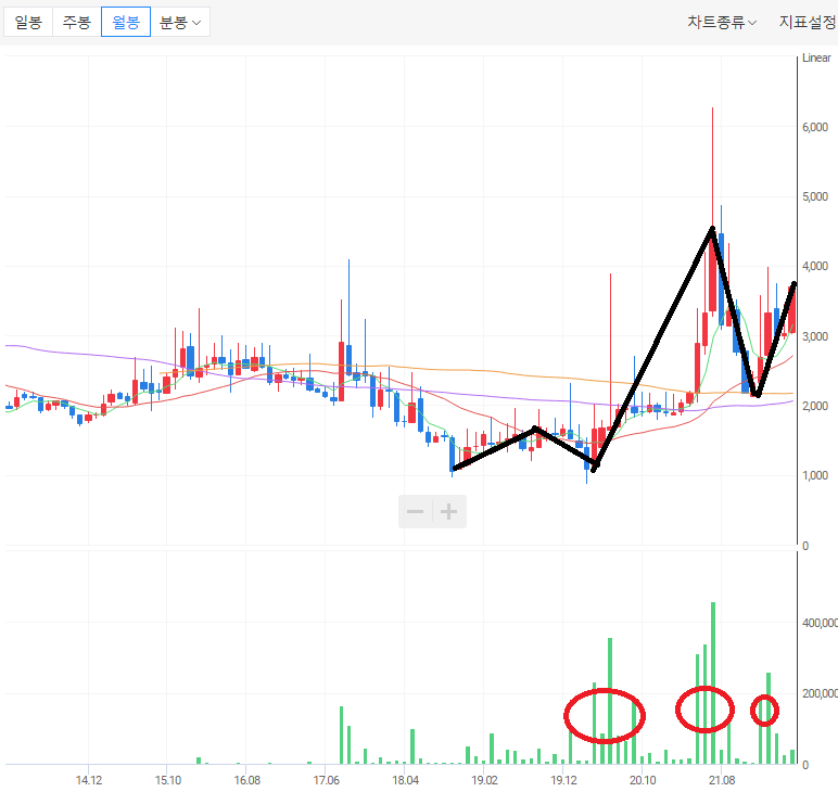 ㄴ) 월봉 차트에서 전고점을 뛰어넘을 시도를 하려는 모습이지만, 거래량이 아직은 부족한 모습이다. 상승 구간이지만, 윗꼬리가 길게 나올 수 있는 것을 염두에 두어야 한다.