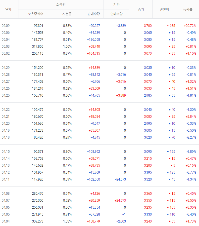 ㄴ) 5월 9일 수급은 개인 1.9억 매수, 외국인 2.2억 매도, 기관 0.1억 매도하였다.