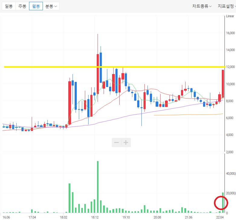 ㄴ) 월봉 차트에서 2018년에 대세 상승한 후에 조정받으면서 쉬다가 현재는 거래량이 들어오고 있으며 매물대 위를 넘어서 전고점을 뛰어넘으려고 시도하고 있다.