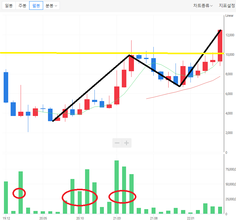 지금은 상승구간으로 월봉 차트로 보았을 때 아직까지 상승의 목표치가 남아 있지만, 오늘의 상한가로 주가는 급등하는 양상이다.