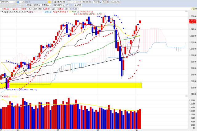 코스닥은 차트에서도 알 수 있듯이 전고점을 넘어 갈려고 한다.