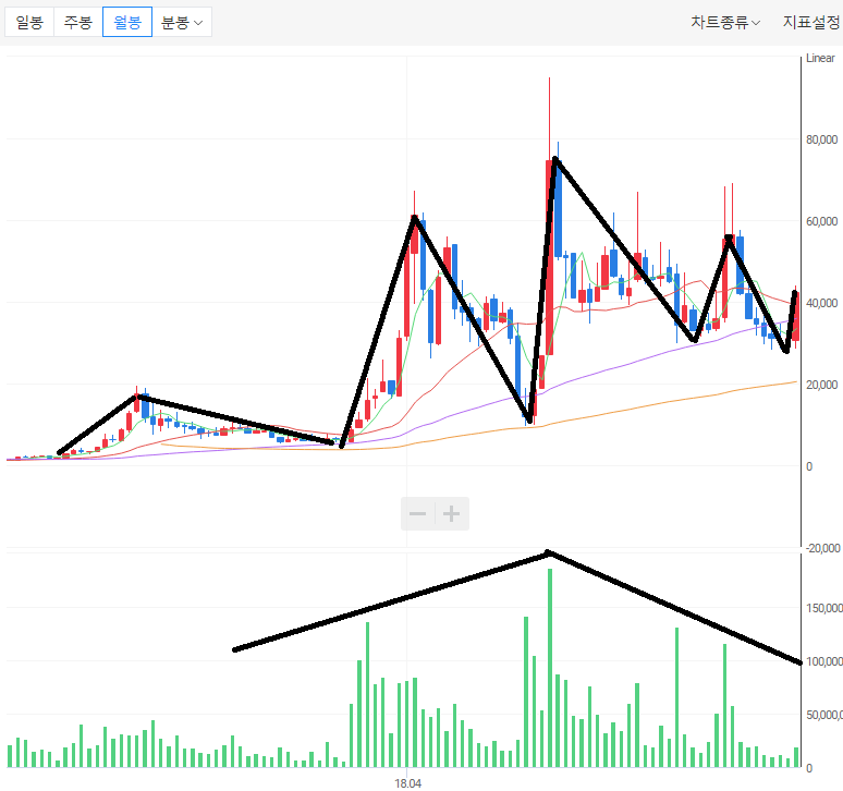 ㄴ) 월봉 차트에서 2019년 10월 약 3개월 만에 주가가 10배 상승하여 최고점을 만들고 하락하고 있다. 전고점을 뛰어넘어 크게 상승하기 위해서는 거래량이 필수요소라고 보인다.
