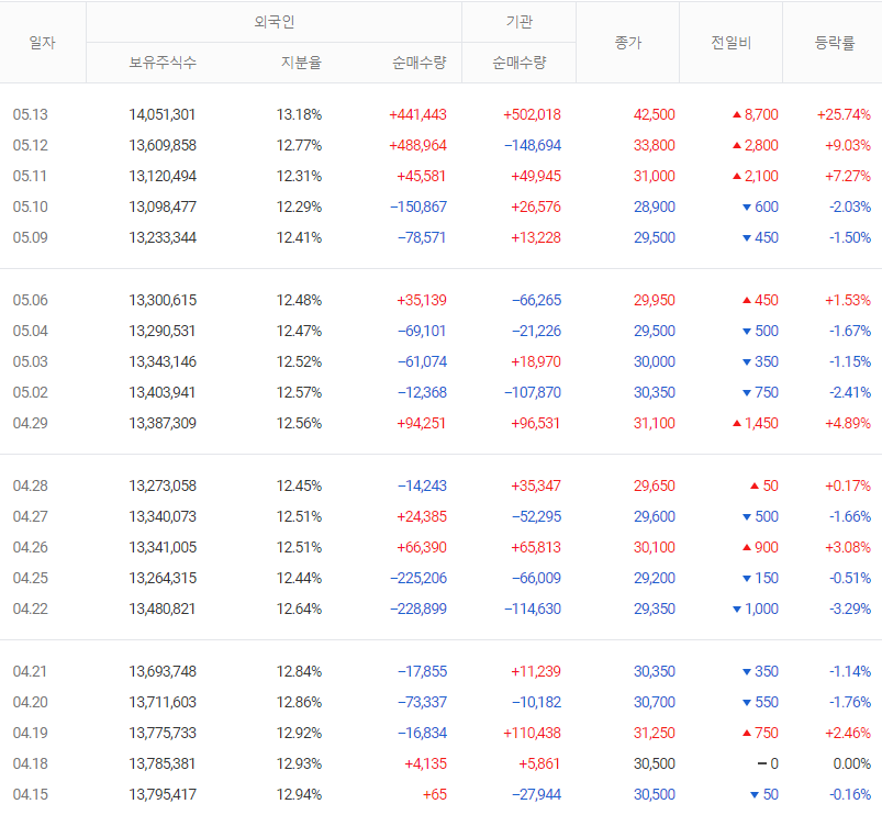 ㄴ) 5월 13일 수급은 개인 385.9억 매도, 외국인 190.9억 매수, 기관 208.5억 매수하였다.