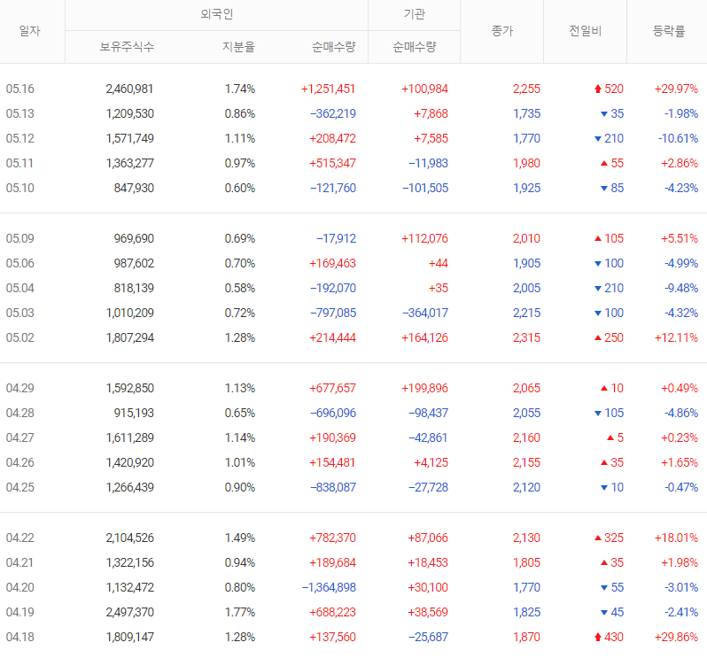 ㄴ) 5월 16일 수급은 개인 30.2억 매도, 외국인 27.1억 매수, 기관 2.3억 매수하였다.