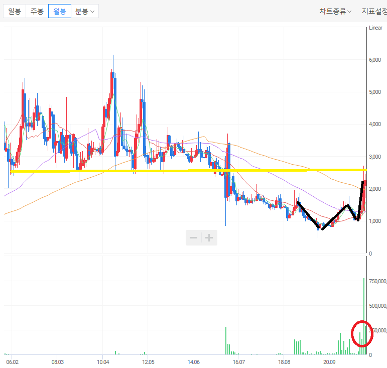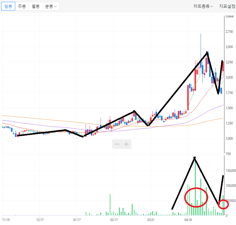 ㄴ) 월봉 차트에서 매물대까지 상승하였다가 조정받고 다시 상승하려는 모습이다. 5월의 월봉은 양봉으로 끝날 가망성이 높아 보인다. 다만, 윗꼬리가 길게 달게 될 수 있을지도 모른다.
