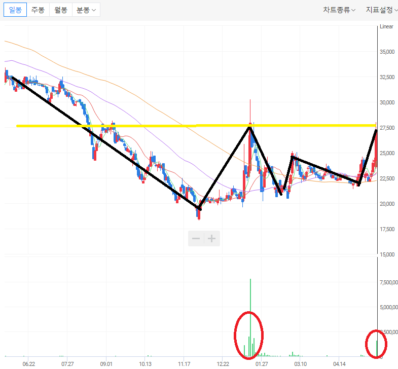 차트는 주가가 하락에서 횡보 그리고 상승하려는 흐름으로 이어지고 있다.