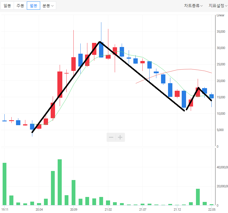 ㄴ) 월봉 차트에서 2020년에 주가는 약 10배 상승하였다. 그 후에 조정을 받고 쉬고 있는 모습이다.