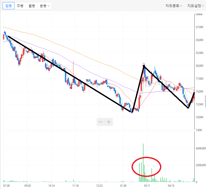 ㄱ) 일봉 차트에서 지속적으로 하락하다가 지난 1월에 저가라고 인식된 매수세가 들어오면서 횡보하고 있는 모양새이다.