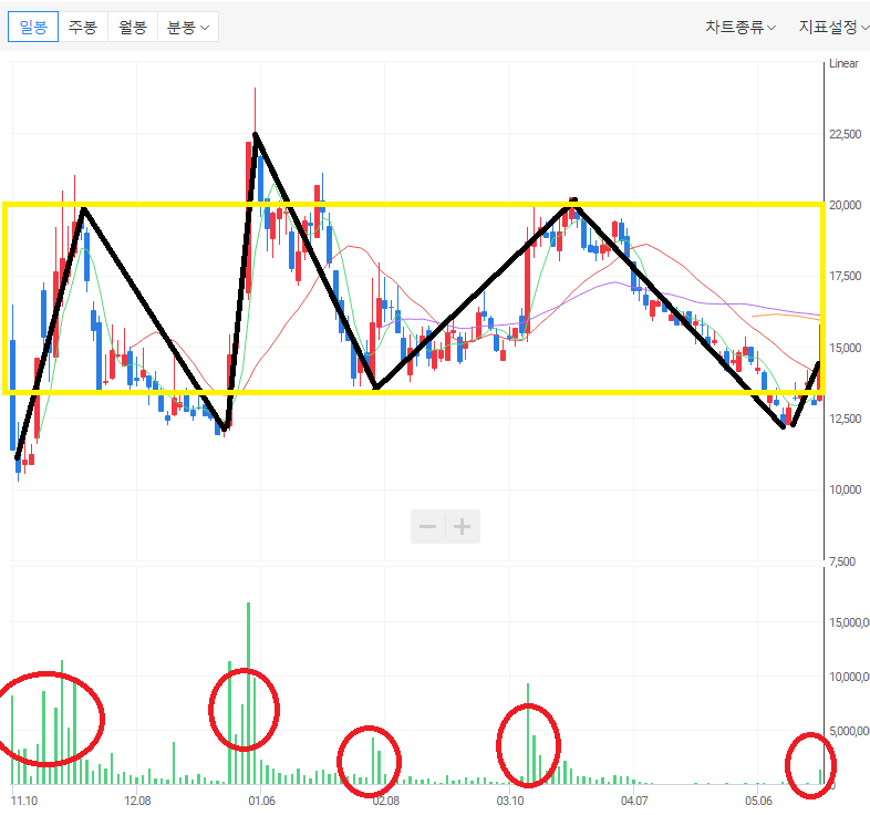 ㄴ) 작년에 거래량이 크게 증가한 모습을 볼 수 있다. 세력이 매도 또는 매수의 흔적이라고 보인다.