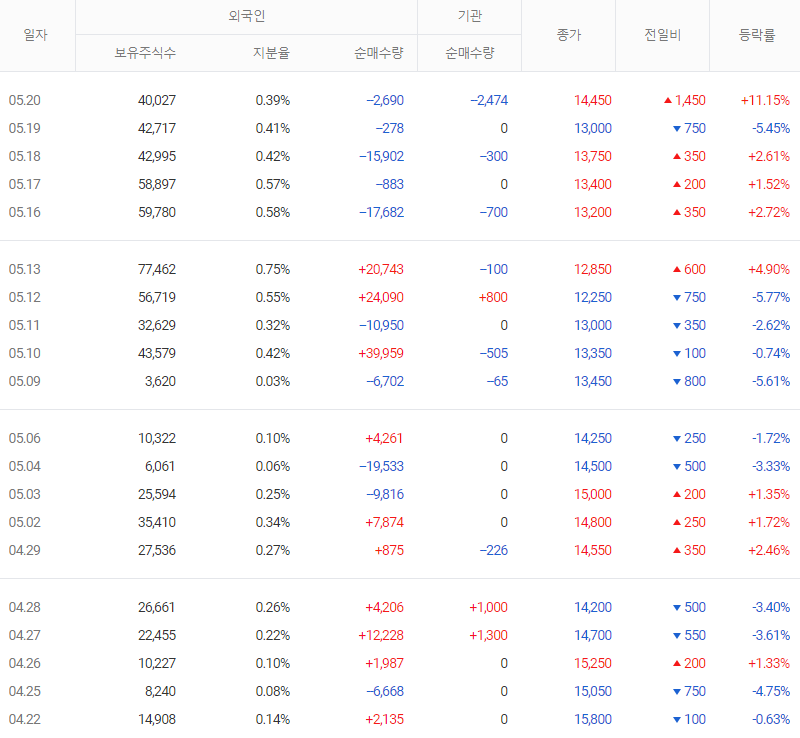 ㄴ) 5월 20일 수급은 개인 2.1억 매도, 외국인 0.5억 매도, 기관 0.3억 매도하였다. 기타 법인이 3.0억 매수하여 5월 20일의 상승은 기타 법인의 수급으로 이루어진 것으로 보인다.