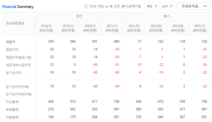신규사업으로 외형적인 성장은 이루어지고 있지만, 영업이익과 당기순이익은 적자이다. 외국인과 기관이 물량을 서로 주고받으며 상승세이다. 차트는 고점을 갱신하며 상승 중이다.