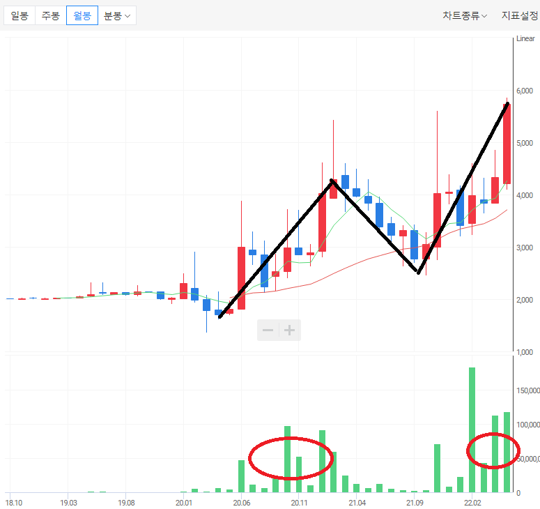 ㄴ) 월봉 차트에서 고점을 갱신하며, 지금은 상승파동이 진행 중이다.