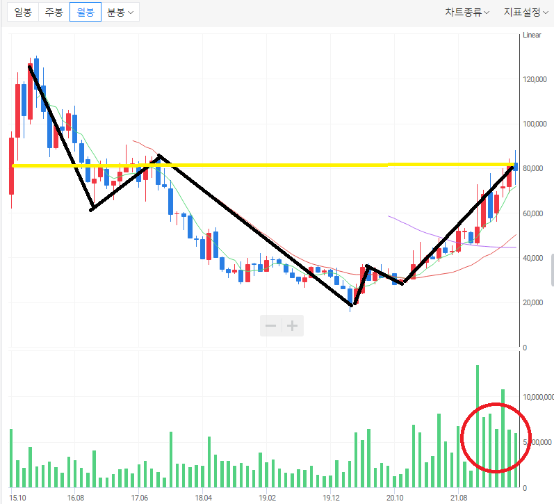 ㄴ) 월봉 차트에서 U자 형태로 상승하고 있다. 전고점에 대한 매물대가 있다는 것도 확인이 필요하다.