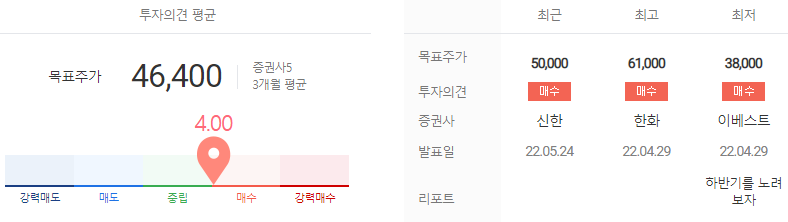 ⓑ 5월 24일 NH증권에서는 목표주가 4.8만 원 투자의견 매수를 제시하였으며, 공급 과잉에서 자유로운 케미컬 포트폴리오로 기업가치 상승할 것이며, 강력한 모멘텀은 신재생에너지 부문이 턴어라운드 하는 것이라고 전망하였다.