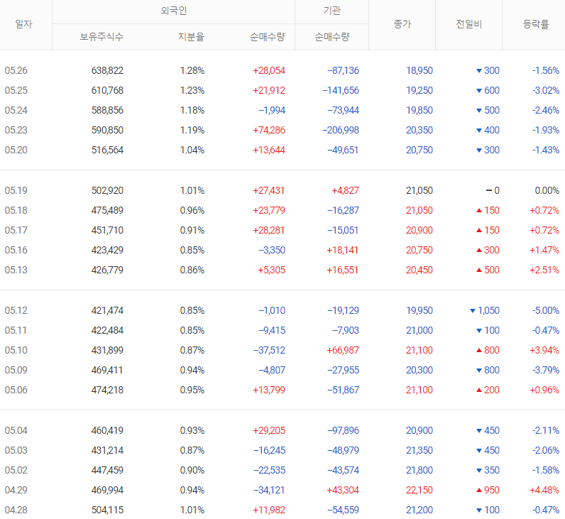 ㄴ) 5월 27일 수급은 개인 35.5억 매도, 외국인 17.0억 매수, 기관 17.2억 매수하였다.