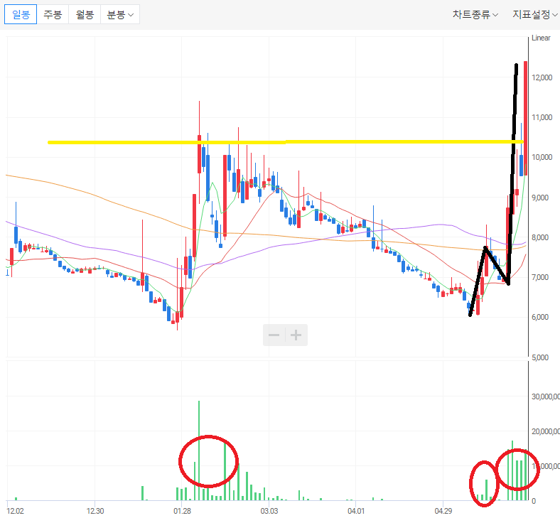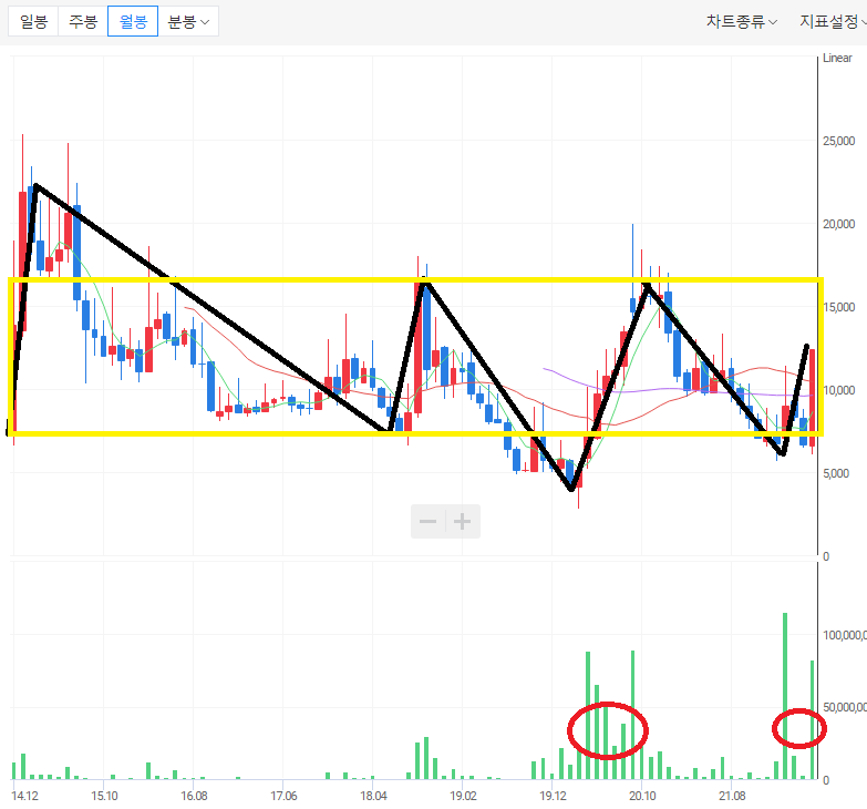 지금의 주가는 월봉 차트에서의 노란 박스권 중간에 있다. 즉, 투자 주의를 받고서도 상승할지 하락할지에 대한 기로에 서있다.
