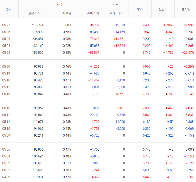 ㄴ) 5월 27일 수급은 개인 10.6억 매도, 외국인 8.1억 매수, 기관 1.4억 매도하였다. 기타 법인이 2.1억 매수하였으며, 내외국인이 1.7억 매수하였다.