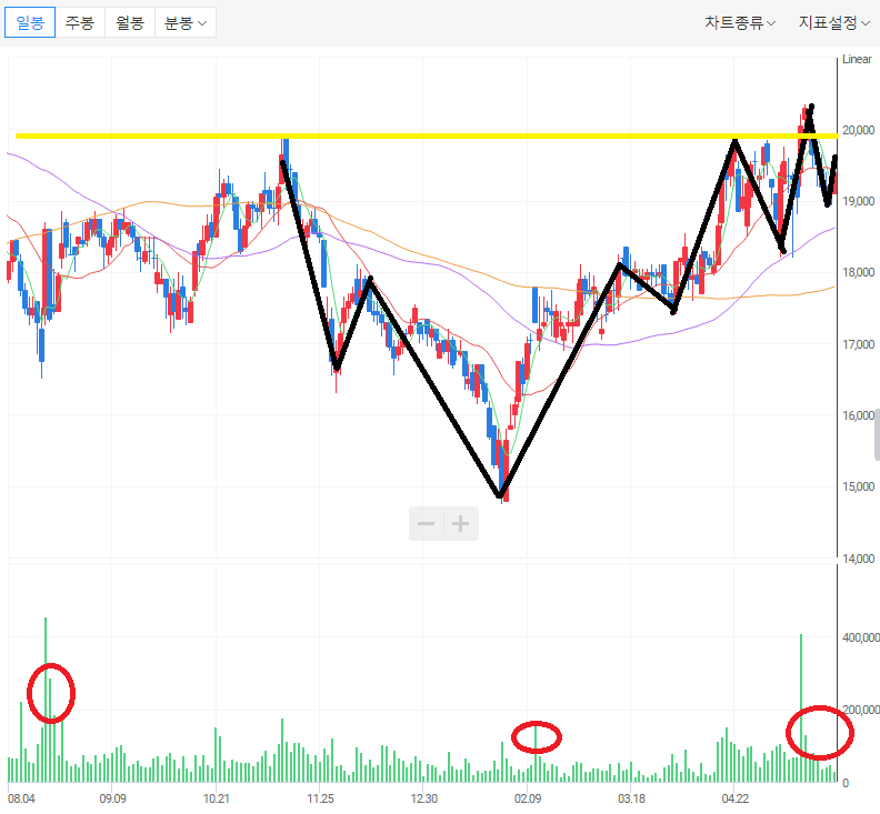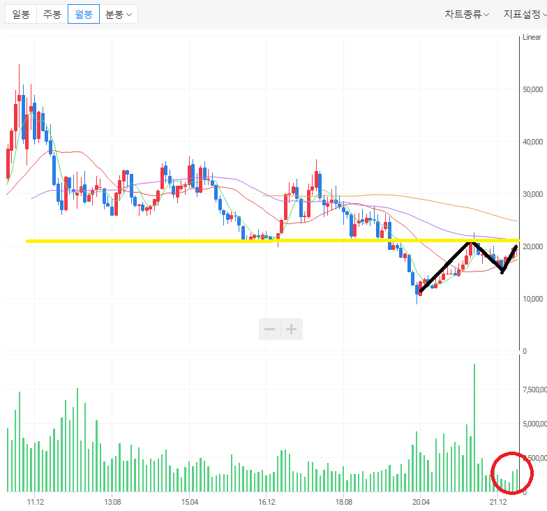 ㄴ) 월봉 차트에서 바닥을 다지면서 상승하려고 하고 있는데 위에 있는 매물대를 넘기가 쉽지 않아 보인다.