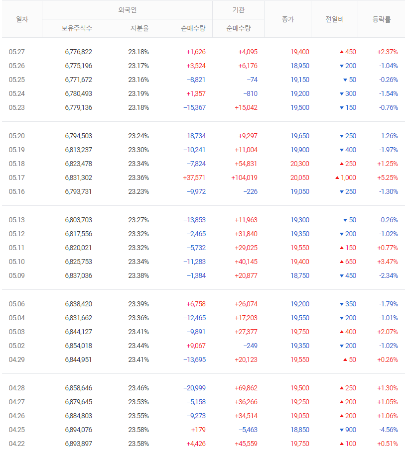 ㄴ) 5월 27일 수급은 개인 1.0억 매도, 외국인 0.3억 매수, 기관 0.7억 매수하였다.