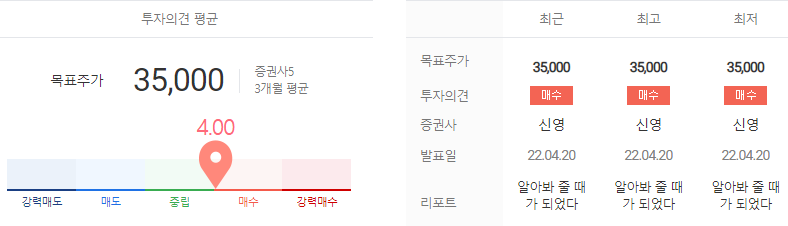 증권사 5 업체의 3개월 평균 목표주가는 3.5만 원이다.