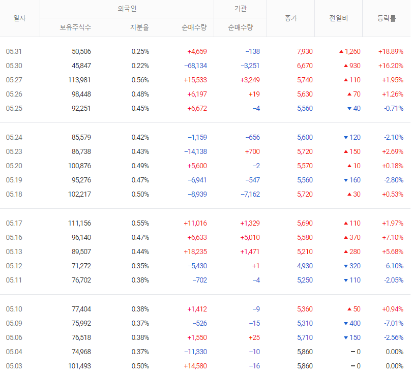 ㄴ) 5월 31일 수급은 개인 1.1억 매수, 외국인 0.07억 매수, 기관 0.1억 매도하였다.